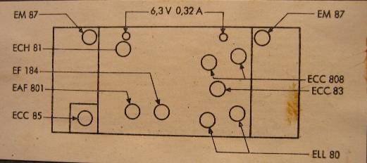 Specificaties: Golfgebieden: LG MG KG 25 - 50,4m FM 87,5 - 104MHz (stereo) Gevoeligheid: FM: 1,6µV (bij 26dB S/R verhouding) AM: 10µV (voor 50mW uitgangsvermogen) Uitgangsvermogen: 2 x 6 Watt (continu) Frequentiebereik: 30 - 20.000Hz (± 1dB) Uitgangsimpedantie: ca. 5 Ohm Harmonische vervorming: < 1% bij 2 x 6W Aansluitingen: Pick-up, Bandrecorder (opname) en Luidspreker (2x) Toonregeling: Lage- en hoge tonen (gescheiden), Diverse filters Buizen: ECC85, ECH81, EF184, EAF801, ECC808 (2x), ECC83, EM87 (2x), ELL80 (2x) Halfgeleiders: AF126 (2x), AC126 (2x), OA79 (2x), BA102, B250C85 Afmetingen: 650 x 255 x 240mm |